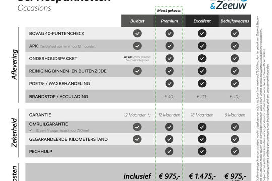 Nulbeurt, 2 kentekenplaten, een in- en uitwendige poetsbeurt, transportkosten, recyclingsbijdrage, leges, gevarendriehoek, lampenset, lifehammer, hesjes, een volle tank brandstof en 84 maanden fabrieksgarantie met een beperking van 150.000km. Tevens is hier de recyclingsbijdrage en verwijderingsbijdrage in opgenomen.