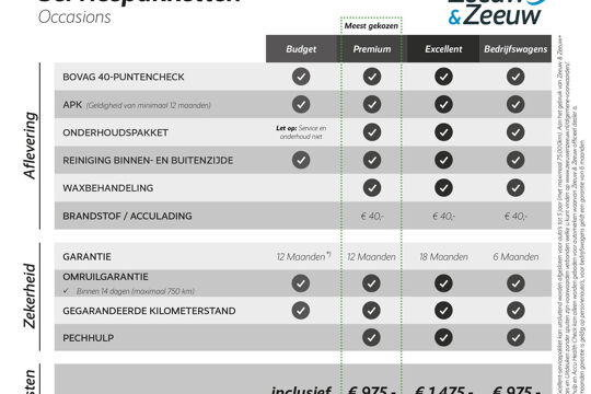 - Gegarandeerde kilometerstand - 18 maanden Bovag garantie - Brandstof / acculading min. € 40,- - Reiniging binnen- en buitenzijde - Waxbehandeling - Pechhulp - Accu Health Check (PHEV & EV) - Onderhoudsbeurt - Distributieriem vervangen, indien nodig binnen 20.000 km of 12 maanden - Remblokken en remschijven vervangen indien niet volgens fabrieksnorm - Banden vervangen indien de profieldiepte minder is dan 3mm - Remvloeistof vervangen indien noodzakelijk - Minimaal 12 maanden geldige APK - Zeeuw & Zeeuw+ Services - Bovag 40-puntencheck - 2 weken BOVAG-omruilgarantie (max. 750 km) (Pechhulp en Accu Health Check kan alleen worden geboden voor automerken waarvan Zeeuw & Zeeuw officieel dealer is.)